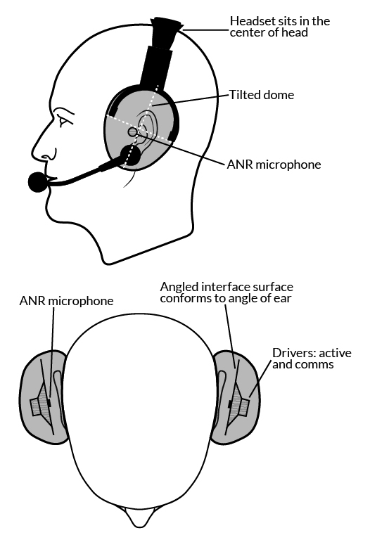 • Is this a “left” or a “right” ear cup? Although ears come in a lot of shapes and sizes, it turns out statistically that the ear opening is not symmetrically “centered” within the dome…it is forward and below center. The mic placement must accommodate human physiology to deliver optimal performance. Consequently, the best performance is attained when ear cups are designed to fit specific ears (left and right). You’ll notice in the diagram that the domes are tilted and shaped to better fit the ear, and that the mounting plates that hold the mic and active speaker are also angled to better profile the ear shape in the dome. Attention to these ergonomic and acoustic details substantially improve both comfort and performance. (It’s interesting to note now that more manufacturers are at least noting this important feature in their documentation. Even headsets that can be reversed should not be worn that way!)