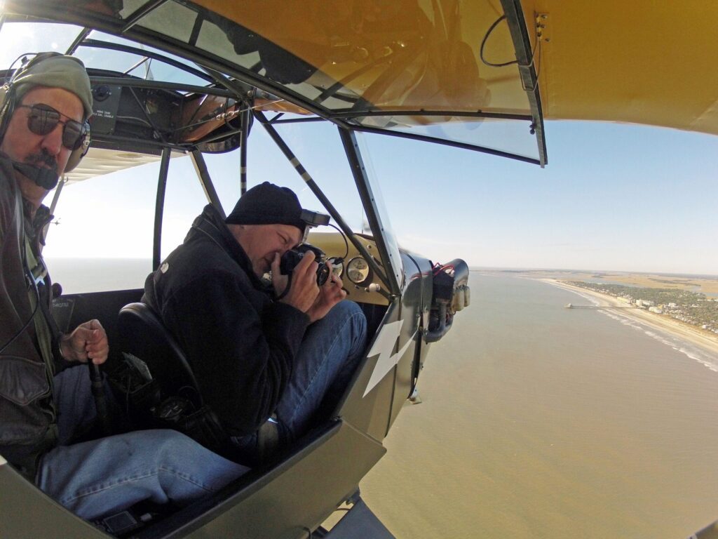 SouthWings pilots are a diverse bunch. Jon Engle, of Charleston, South Carolina, is a former Air Force fighter and reconnaissance pilot. After retirement, he became a SouthWings volunteer, flying his World War II-era observation airplane. He says, “What I enjoy is the meaningfulness of each flight.  One of my first missions involved flying a research scientist along the beach front where a restoration project had built a ‘groin’ (a series of rocks similar to a jetty) to reduce beach erosion. We flew over the site each month to photograph it with a digital camera that recorded precise GPS information, taking hundreds of images from different angles and altitudes. Concurrently, a research vessel recorded underwater radar imagery offshore. All the data was loaded into a special computer program by graduate students from the College of Charleston to create a 3-D image that could be manipulated and measured, and which showed the effects of the ‘groin’ along the beach, both above the waterline and underwater.  It was a fascinating combination of photography, oceanography, geology, and advanced computer science, and my little 1942 airplane and I got to be a major part of it.”